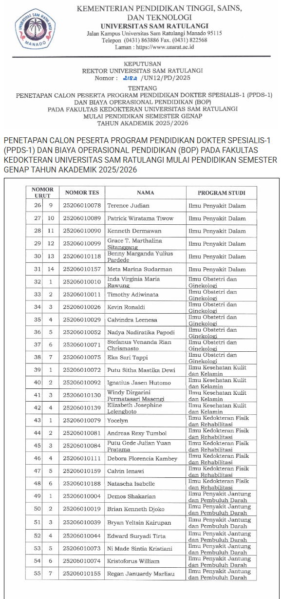 PENETAPAN CALON PESERTA PROGRAM PENDIDIKAN DOKTER SPESIALIS-1 (PPDS-1) DAN BIAYA OPERASIONAL PENDIDIKAN (BOP) PADA FAKULTAS KEDOKTERAN UNIVERSITAS SAM RATULANGI MULAI PENDIDIKAN SEMESTER GENAP TAHUN AKADEMIK 2025/2026